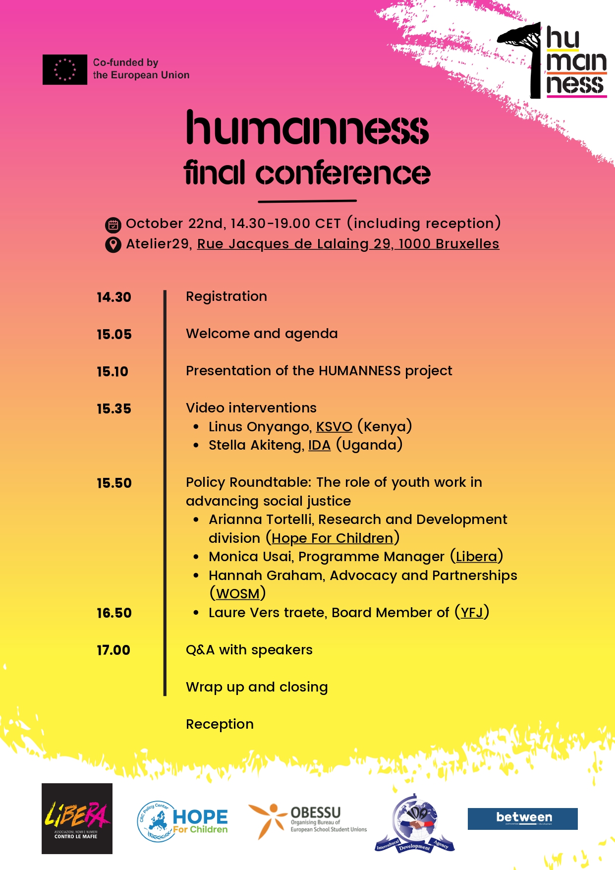 Il 22 ottobre, l'Organising Bureau of European School Student Unions (OBESSU), rete europea di rappresentanza studentesca, ha riunito a Bruxelles i partner del progetto HUMANNESS, insieme a stakeholder e policy-maker nel campo dell'animazione giovanile, delle iniziative di solidarietà e della partecipazione giovanile, per la conferenza conclusiva: The Role of Youth Work in Advancing Social Justice.