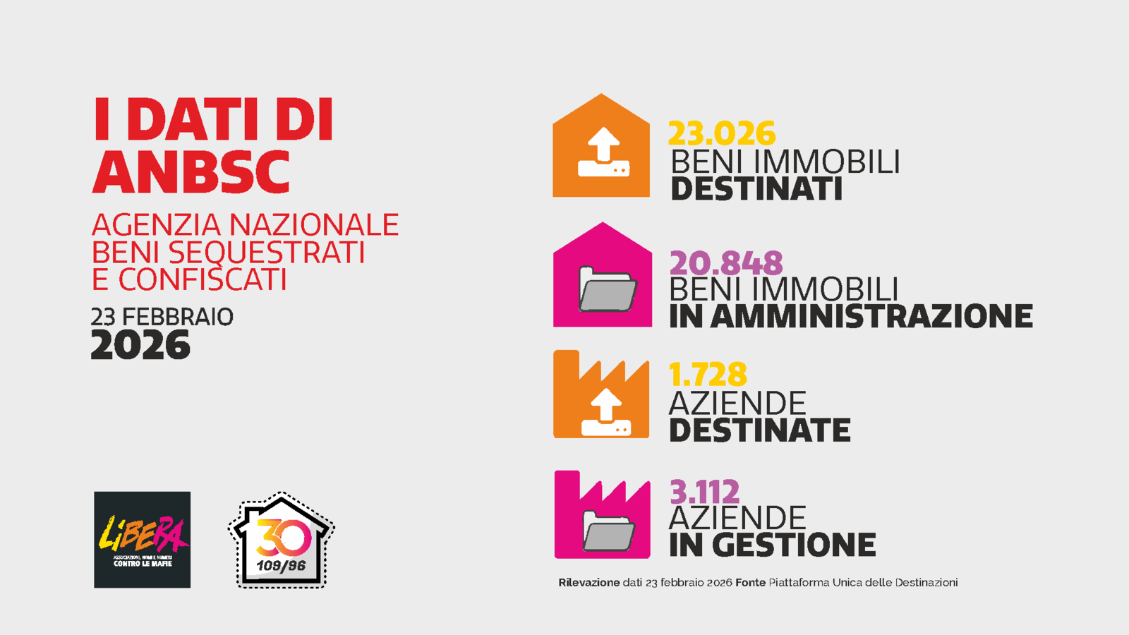 Secondo i dati dell’Agenzia nazionale per l’amministrazione e la destinazione dei beni sequestrati e confiscati alla criminalità organizzata (23 febbraio 2026): sono 23.026 i beni immobili (particelle catastali) confiscati e destinati ai sensi del Codice antimafia mentre sono in totale 20.848 gli immobili ancora in gestione ed in attesa di essere destinati.