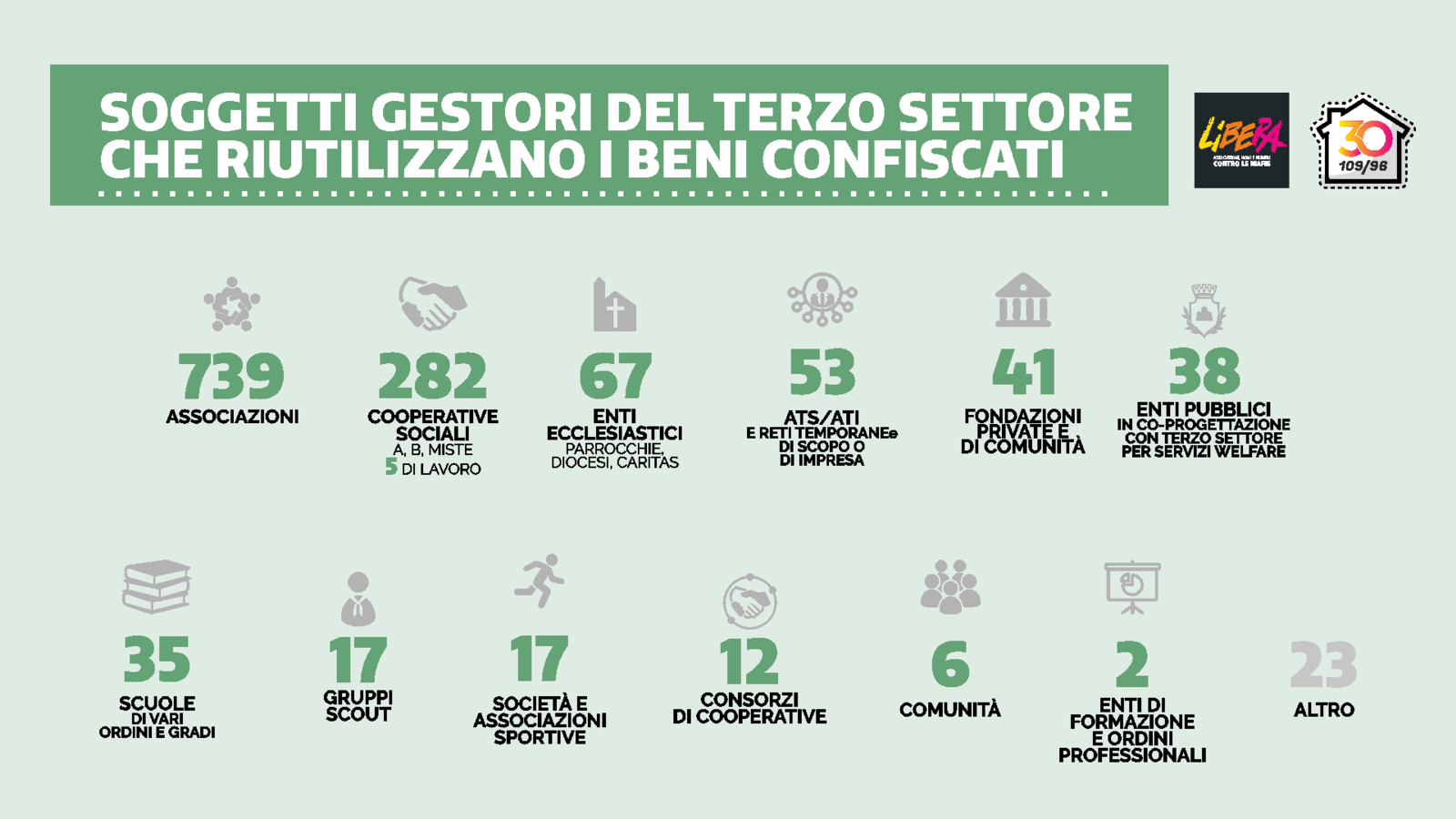Il censimento realizzato da Libera mostra una rete ampia e articolata di realtà impegnate nel riutilizzo sociale dei beni confiscati, dove in silenzio opera una comunità alternativa a quella mafiosa, che lavora e si impegna a realizzare un nuovo modello di sviluppo territoriale. Un paese con 1332 soggetti della società civile organizzata che gestiscono beni confiscati, più di 739 associazioni di diversa tipologia in 19 regioni e in 448 comuni con 35 scuole di ogni ordine e grado che usano gli spazi confiscati come strumento didattico e che incidono nel tessuto territoriale e costruiscono economia positiva.